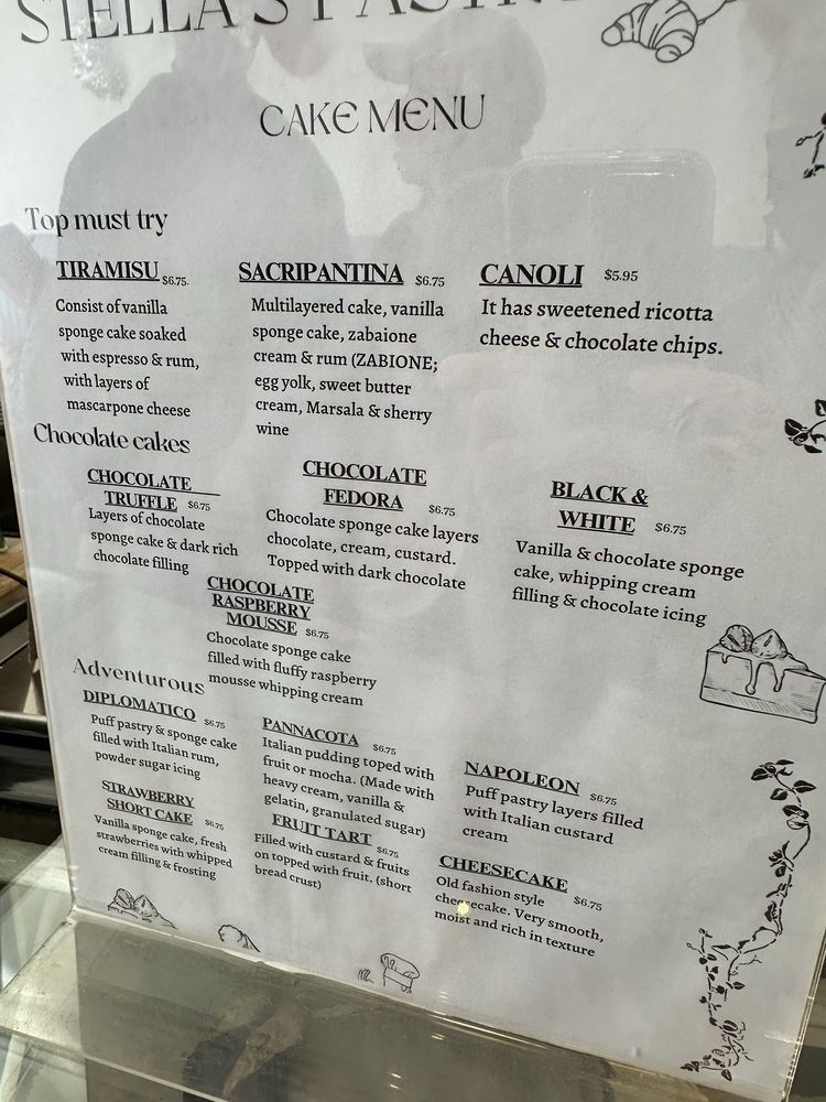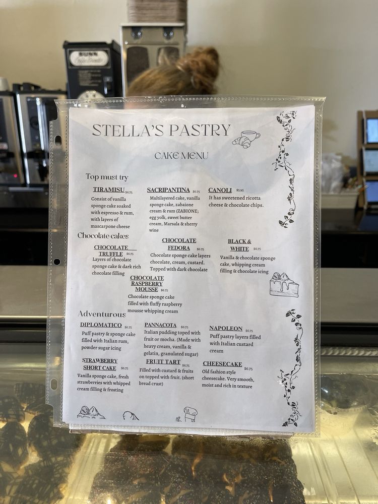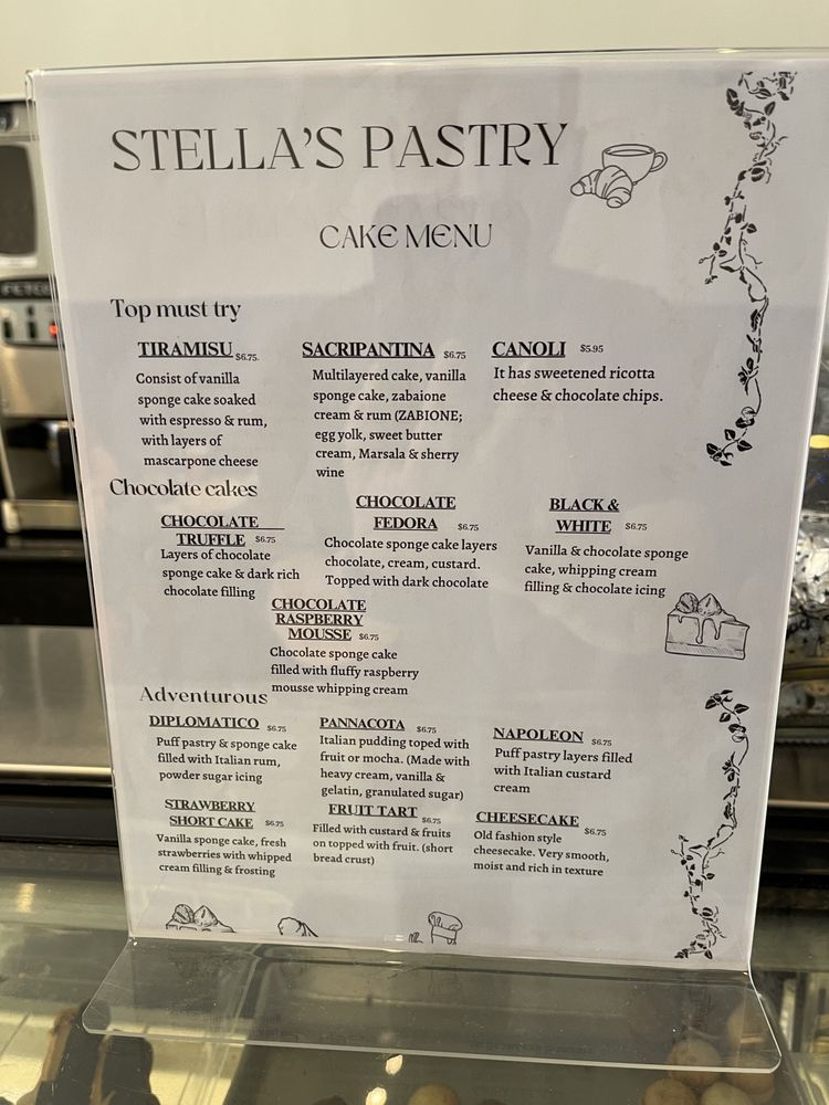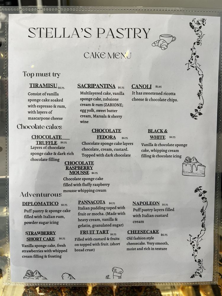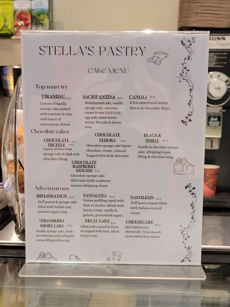 Stella Pastry & Cafe, located in San Francisco, offers a delightful menu filled with tempting treats. From the luxurious Black and White and Chocolate Truffle whole cakes to the traditional Italian Sacripantina and Tiramisu options, there is something for every sweet tooth. The cafe's selection of sweet treats like the Blueberry Cheesecake, Cannoli, and Choco Truffle are perfect for satisfying your cravings. With QR code menus available and a variety of payment options accepted, Stella Pastry & Cafe ensures a convenient and seamless dining experience. The emphasis on eco-friendly practices, such as providing compostable containers and plastic-free packaging, highlights their commitment to sustainability. Whether you're in the mood for a slice of cake or a box of cookies, Stella Pastry & Cafe promises a delightful experience for all.